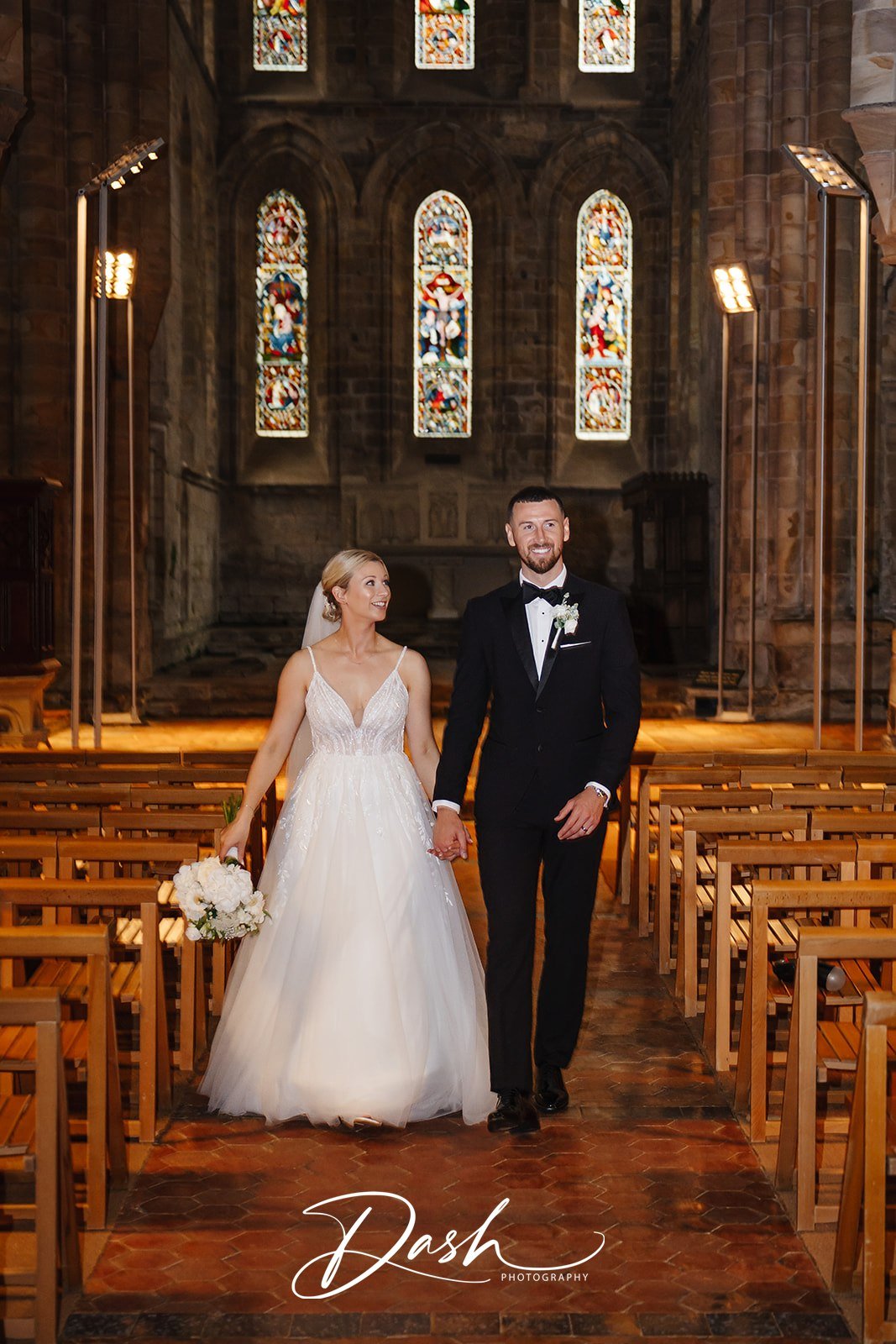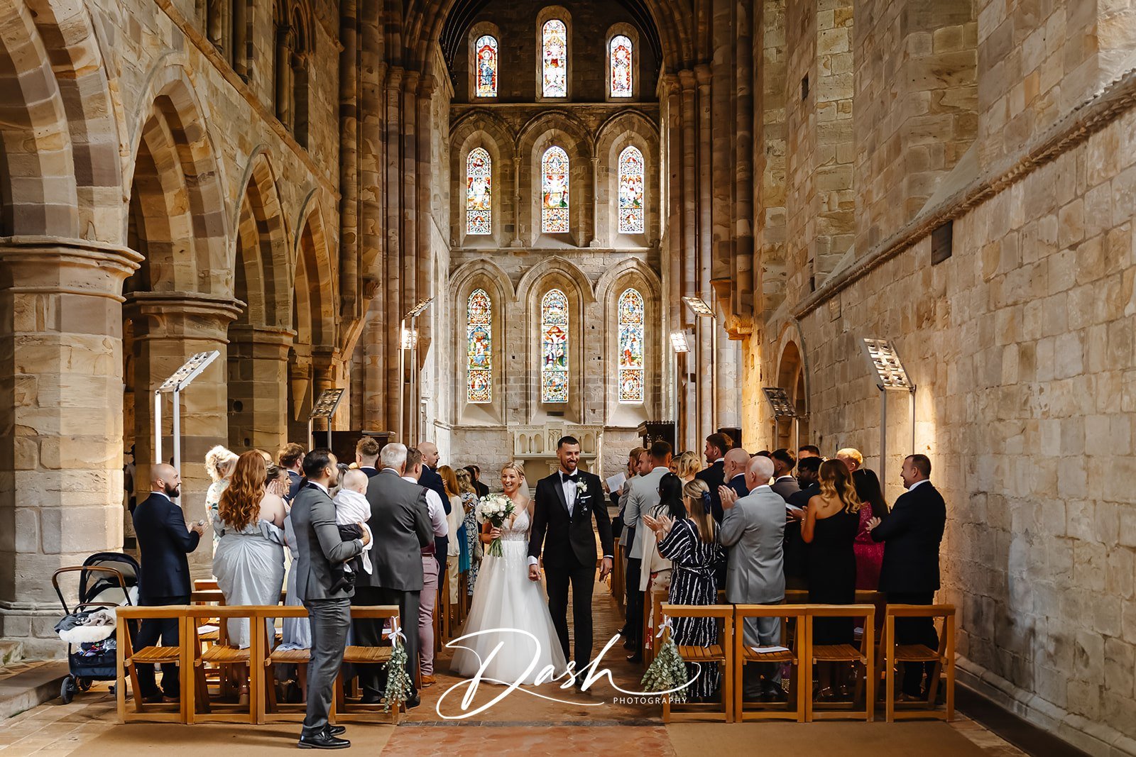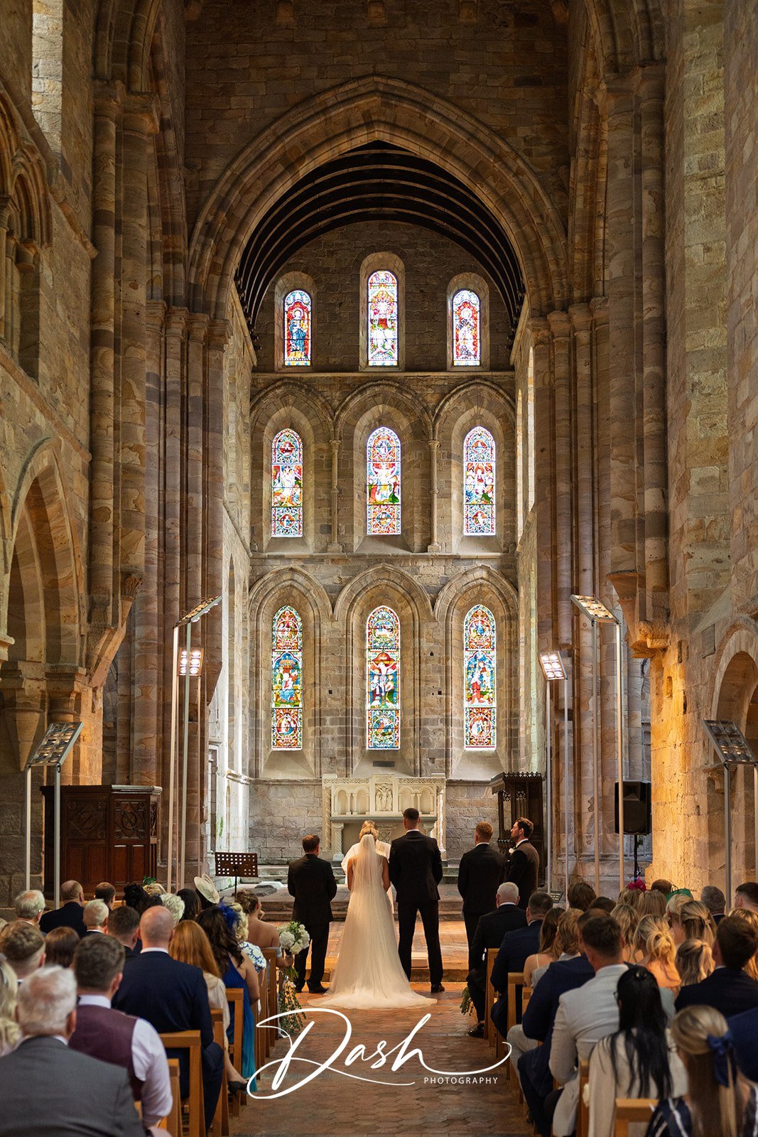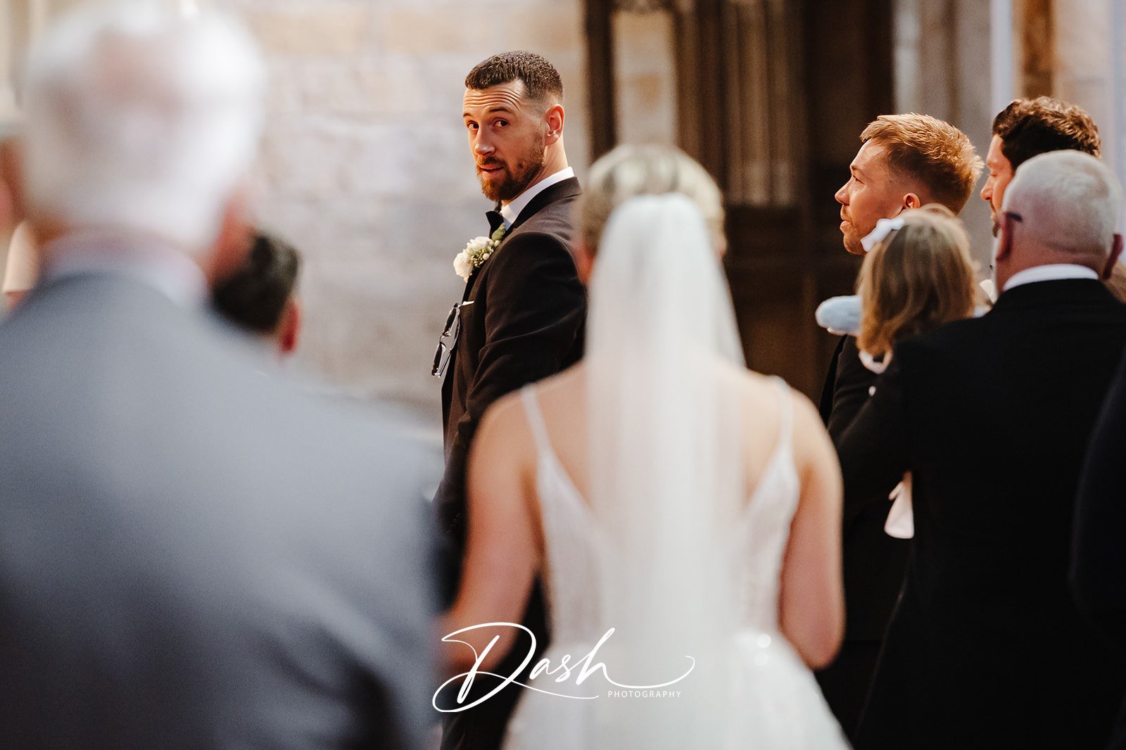 Brinkburn Priory is one of the most atmospheric ceremony spaces in the North East. With its high stone arches and soft natural light, it creates an almost cinematic feel. As the music began and Natalie entered the Priory, all conversation hushed. The moment she reached Ryan at the altar, it was pure emotion — simple, genuine, and full of love.