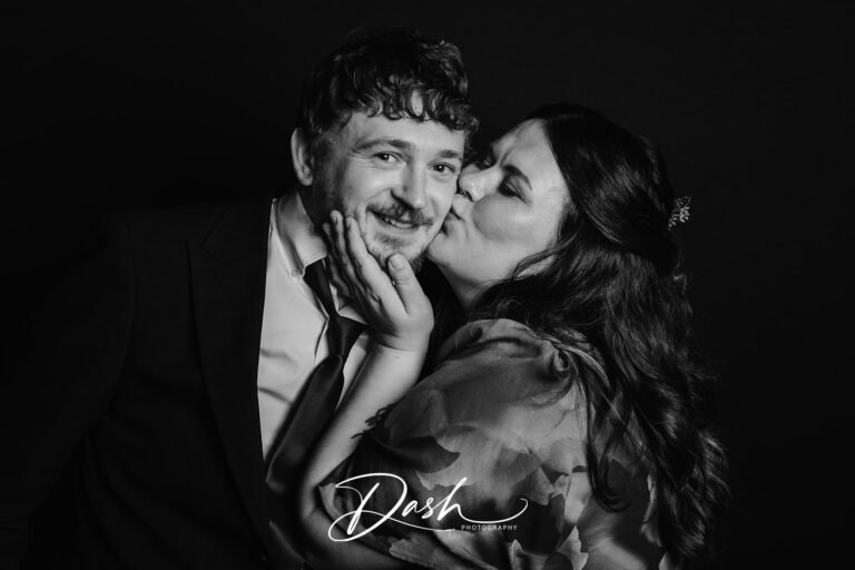 Midnight Portraits by Dash is an elevated black-and-white portrait experience for weddings and events. Guests step into a minimal, studio-style setup — a pure black background, flattering light, and the artistry of timeless portraiture.